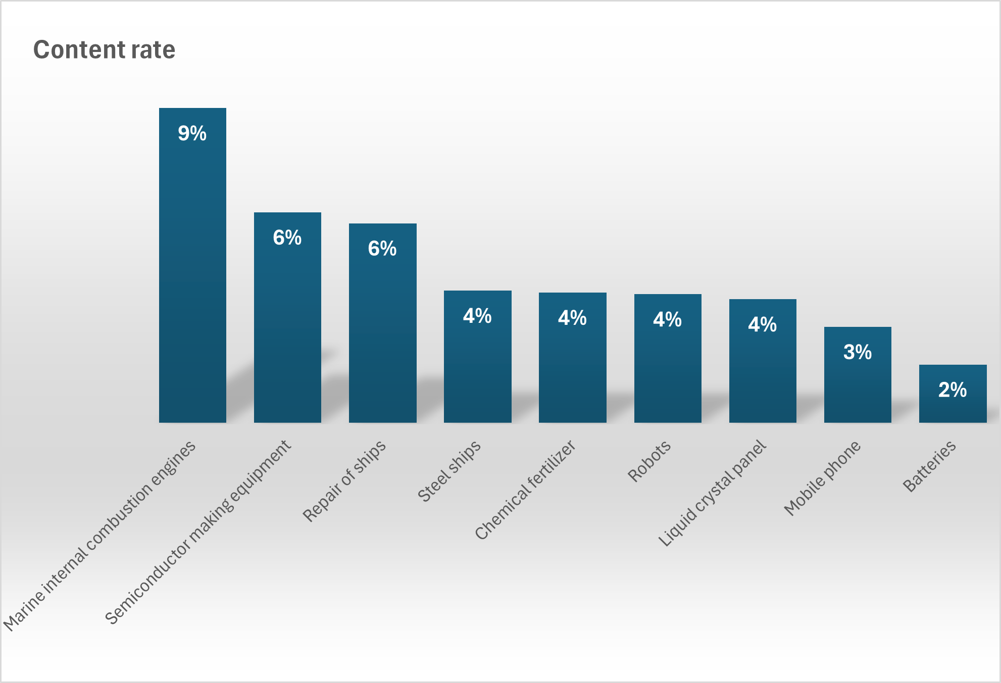 Note: The vertical axis presents each product's content rate (%) of Specified Critical Materials (designated by the Economic Security Promotion Act) that are identifiable in the sector classification of input-output tables. These are very preliminary estimates for illustrative purposes.