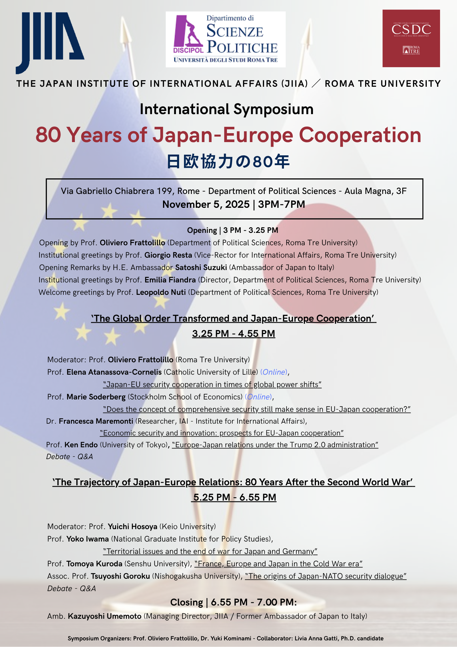 関連URL(ローマ第3大学のウェブサイト):https://csdcina.uniroma3.it/2025/10/80-years-of-japan-europe-cooperation-simposio-internazionale-tra-il-japan-institute-of-international-affairs-e-roma-tre-university/