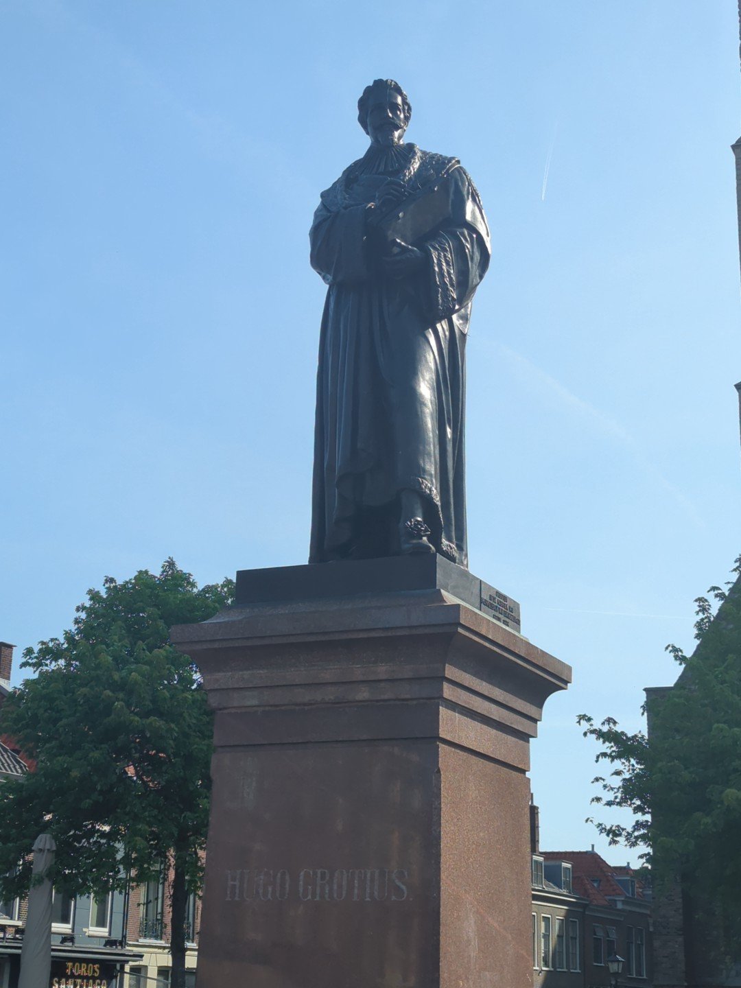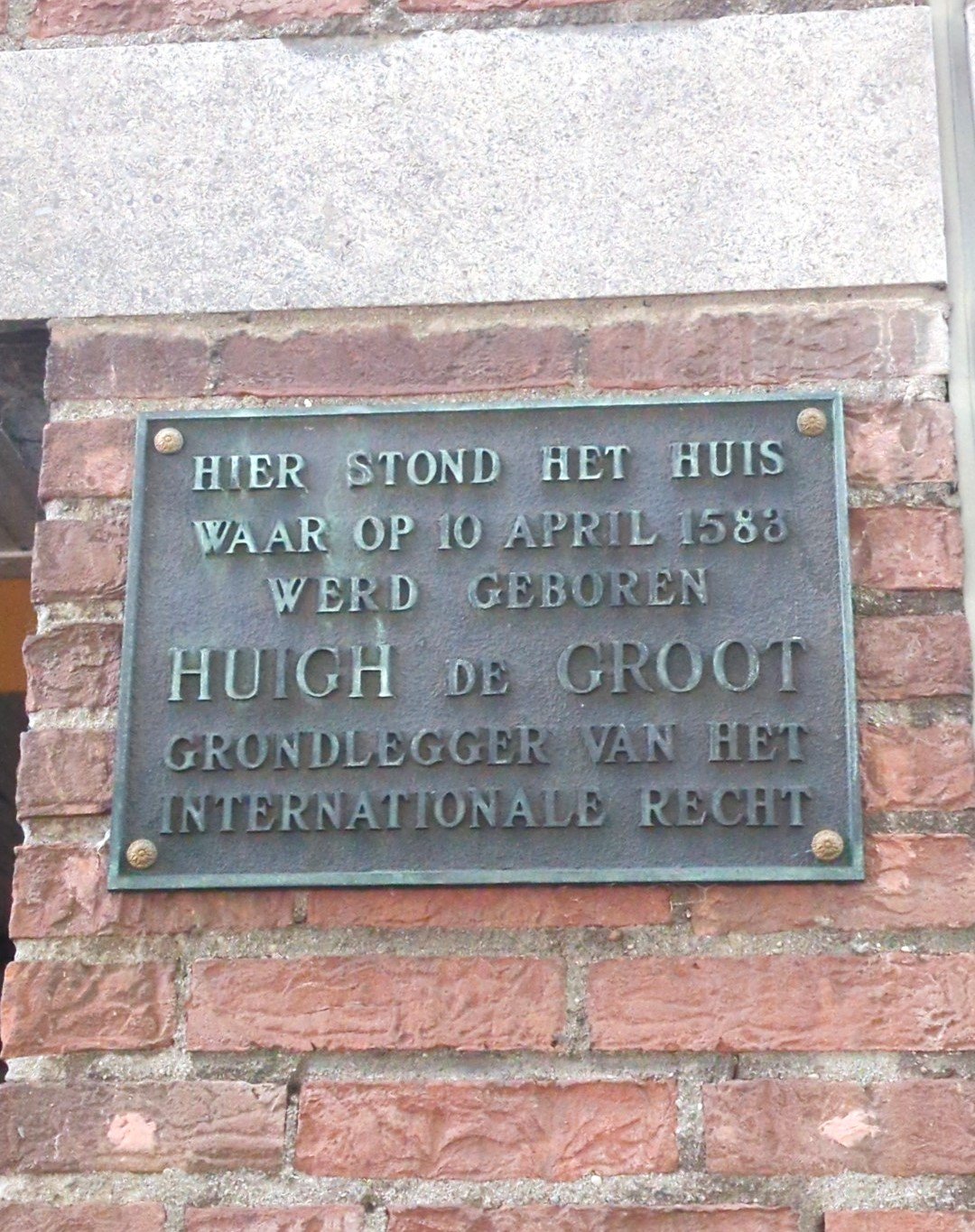 「国際法の父」と呼ばれることのあるフーゴー・グロティウス(Hugo Grotius. オランダ名ハイフ・デ・フロートHuigh de Groot)は、1583年デルフトに生まれ、1594年ライデン大学に入学、1599年ハーグで弁護士登録を行い、1607年からはオランダ連邦共和国の官僚となり、ハーグを中心に活動した。しかし、1619年抗議書派と反抗議書派との争いに関与した罪で終身禁固刑に処せられ、ホルクム近郊のルーフェステイン城に幽閉された。2年後妻の助けにより城から脱獄し、パリへ亡命した。そして、1625年『戦争と平和の法』をパリの出版社から発刊した。その後、デルフトやアムステルダムなどに短期間滞在したが、正式のオランダ滞在は認められなかった。1634年駐仏スウェーデン大使に就任し、1645年8月28日ロストックで病没した。