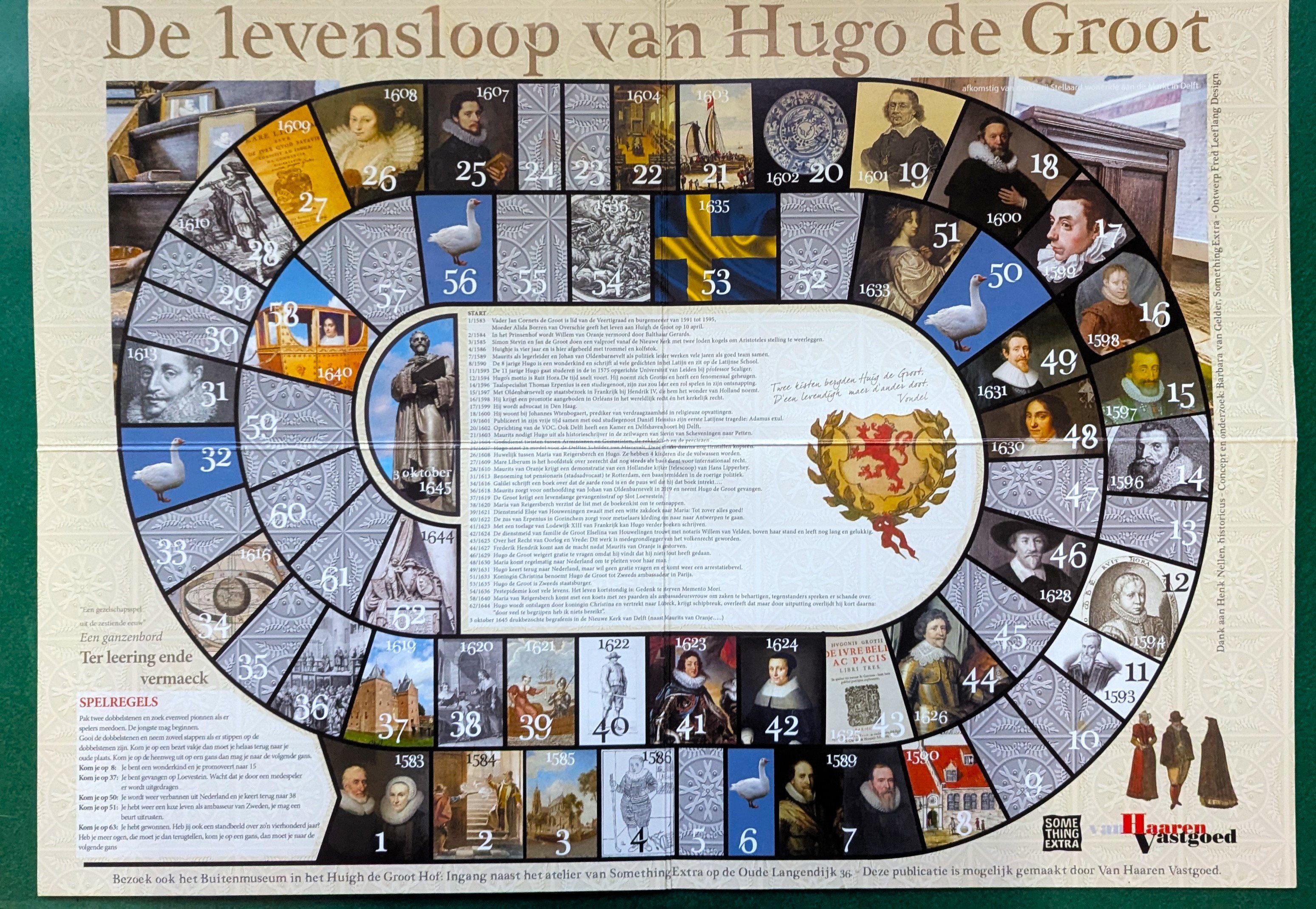 このお店の経営者バルバラ・ファン・ゲルダー(Barbara van Gelder)さんとはいろいろな話ができたが、もっとも興味深かったのは、コロナ禍のために自由な時間が豊富にあった時に、グロティウスの生涯について、可能な限り図版を入れ、グロティウスの年表を付けた「フーゴー・グロティウスの生涯(De levensloop van Hugo de Groot)」という双六を作成したということであった。10ユーロで購入できた(写真2)。この双六に記されているグロティウスの年表は、あとで紹介するヘンク・ネレン(Henk Nellen)教授の監修を受けているとのことであった。後日教授に確認したところ、たしかに一部監修したとのことであったので、正確な情報に基づく双六ということになる。