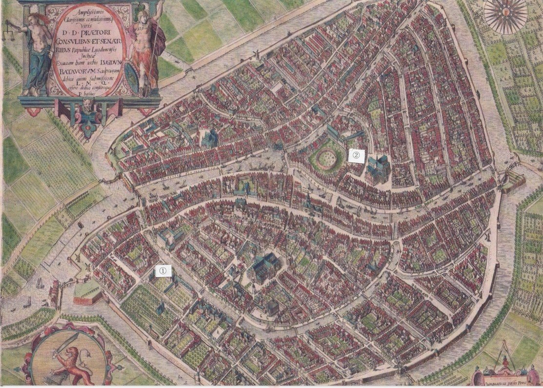 ハーグでのシンポのオプショナル・ツアーとして企画されたのが、「ライデンでのグロティウス散策」である。Grotius in Leiden: A Walking Tour (Leiden: Leiden Publications, 2017)という冊子の著者である、ヤン・ヴァジンク(Jan Waszink)氏が、ライデン市内のグロティウスゆかりの地を案内してくれるという企画である(以下の叙述の多くは同書に依拠している)。シンポの基調報告をしたイッテルスム教授とその連れ合い(17世紀の歴史の専門家)のお二人も説明役で参加された。1時間半ぐらいの予定であったが、実際には4時間近くに及んだ。もっとも、グロティウスに直接関連するのは、入学時から約1年間叔父のコルネーリス(ライデン大学の法学の教授)夫妻と一緒に住んでいた地(Rapenburg 33)と、1595年から1598年にライデンを去るまでの間住んでいた地(Hooglandsekerkgracht 31-33)の二カ所のみであった。1600年にピーター・バスト(Pieter Bast)が描いたライデンの地図の①と②である(写真5)。