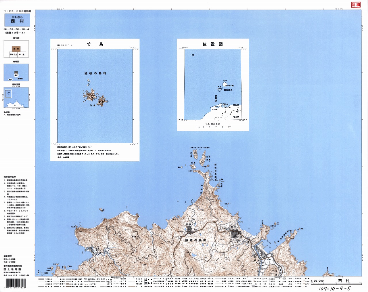 | 地図名 | 西村 | 位置図(250万分1)に「竹島」と記す。分図(2万5千分1、2007年測量)に「隠岐の島町 竹島 東島 西島」と記す。竹島を日本領とする。 |