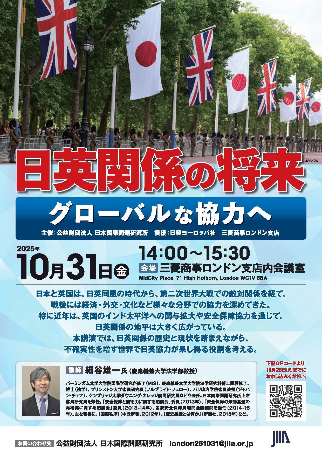 2025年10月31日、細谷雄一・慶應義塾大学法学部教授を講師に招いて、講演会「日英関係の将来―グローバルな協力へ」(主催:日本国際問題研究所、後援:日経ヨーロッパ社、三菱商事ロンドン支店)を開催しました。講演では、19世紀以来の日英関係の歴史を俯瞰しつつ、近年の安全保障協力の発展、そして今後の日英協力の行方が展望されました。在英日系企業などから50名余りの方にご参加いただき、質疑応答でも活発な議論が行われました。