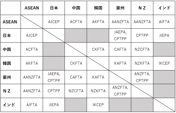 3 AJCEP:日・ASEAN包括的経済連携協定、ACFTA:ASEAN・中国自由貿易協定、AKFTA:ASEAN・韓国自由貿易協定、CKFTA:中・韓自由貿易協定、AANZAFTA:ASEAN・豪・NZ自由貿易協定、JAEPA=日・豪経済連携協定、CAFTA=中・豪自由貿易協定、KAFTA=韓・豪自由貿易協定、NZCFTA=NZ・中自由貿易協定、NZKFTA=NZ・韓自由貿易協定、ANZFTA=豪・NZ自由貿易協定、AIFTA=ASEAN・印自由貿易協定、JIEPA=日・印経済連携協定、IKCEP=、印・韓包括的経済連携協定。
