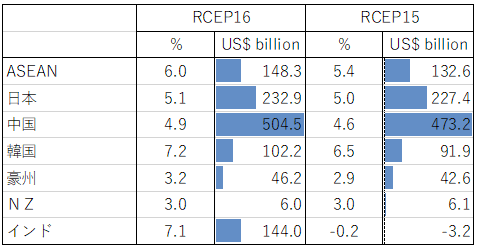 続いて、インドを除くRCEP15について、インド離脱の影響を中心に見ていく。第一に、インドがRCEPに参加しないことの機会損失が非常に大きい。+7.1%のGDPの押し上げ効果を逸することになる。第二に、RCEP15では、インドは-0.2%のマイナスの効果を被ることになる。これは、インドを除くRCEP参加国間での貿易障壁が削減され輸入価格が下がることで、輸入先をインドから他のRCEP参加国に切り替える「貿易転換効果」が生じるためである。第三に、インドが抜けることで全体の押し上げ効果は縮小する。マイナス影響を比較的大きく受けるのは、ASEAN(6.0%→5.4%)、中国(4.9%→4.6%)、韓国(7.2%→6.5%)である。具体的な例を挙げると、インドネシア、マレーシアはインド向けのエネルギー資源の輸出、タイ、ベトナムはインド向けの化学製品、自動車、電子機器等の工業製品の輸出でマイナスの影響を受ける可能性がある。日本は-0.1ポイントと影響は限定的である。インド離脱による他のRCEP参加国への影響はそれほど大きくはないが、将来的にインド経済が成長していくことを見据えると、長期的なインパクトは大きくなると考えられる。