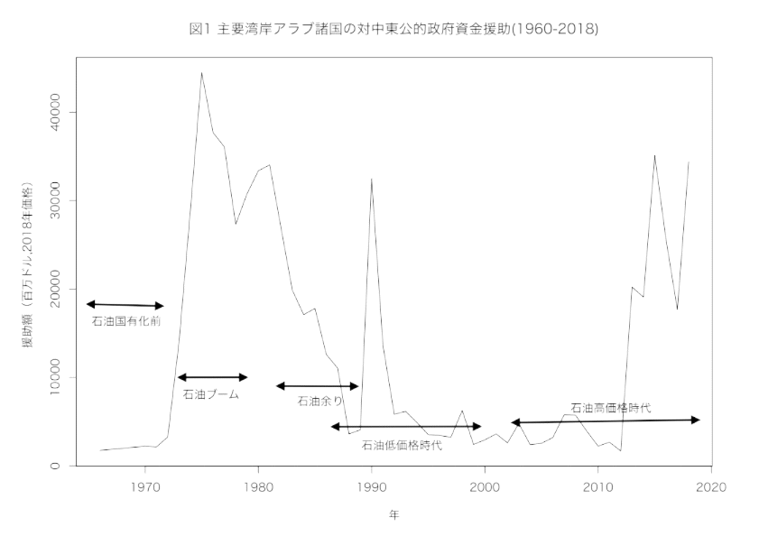 分析結果は以下の通りである。図1は、中東・北アフリカ諸国に対して湾岸アラブ諸国が提供した無償府開発援助の総額である。ここから読み取れることは、第一に石油価格との関係である。1970年代初頭に急激に伸びていること、80年代になって急激に落ち込んでいること、2010年代前半から再び急増していることは、この援助が石油価格と概ね連動していることを示している。石油低価格時期の1990年に援助が突出しているのは、同時期に発生した湾岸戦争に対する支援だと推測される。第二に、その変動幅の大きさである。最も多かった1970年代前半では400億ドルを超えているが、90年代から2010年代前半にかけてはおよそ40億ドル前後で推移しており、変動幅が10倍程度であることが窺える。では、このような湾岸アラブ諸国からの援助の流入は、中東・北アフリカ諸国が受け取った援助全体に対して、どのような影響を与えたであろうか。