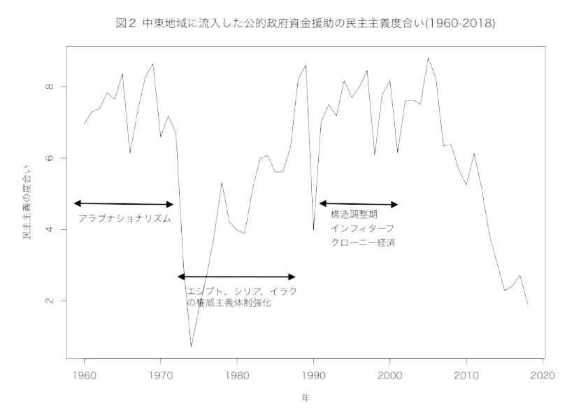 第二に、中東・北アフリカ諸国の統治体制の安定度合いについても、湾岸アラブ諸国の援助が影響を与えている可能性が高い。例えば、エジプトのイスラエルとの単独和平締結(1979年)は、70年代に急増した財政援助が安定的な政権維持を可能とし、エジプトに「アラブの大義」という足枷を外すことを可能としたと解釈できるかも知れない。さらに、1990年代に始まるエジプトやシリアでの構造調整プログラムや2000年代になってみられた部分的な民主化(エジプトにおける大統領選挙制度の改革や、シリアにおける「ダマスカスの春」)は、湾岸アラブ諸国からの援助が減少し、中東・北アフリカ諸国が受け取った援助の民主主義度合いが高まった結果としても理解できる。さらに、2010年代初頭以降の湾岸アラブ諸国からの援助の急増(つまり中東・北アフリカ諸国が得た援助の民主主義度合いの急速な低下)は、「アラブの春」が民主主義的な統治体制の確立につながらなかった状況を説明するかも知れない。