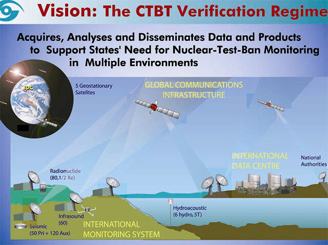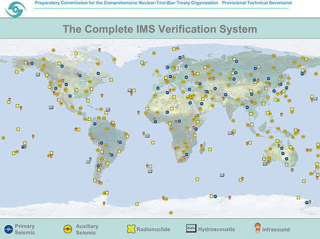 CTBTO準備委員会は、核爆発実験を国際的に監視する国際監視制度(IMS:International Monitoring System)を構築し、すべての締約国に関連情報の提供が可能な検証システムの整備を進めています。IMSは世界中に、地震、放射性核種、水中音波、および微気圧振動の監視を行う4種類の監視観測所網を設置し、地球上のいかなる地域で行われる1キロトン以上の核爆発実験も検知可能としています。