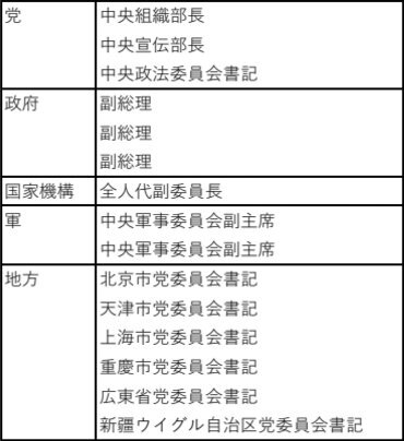 政治局常務委員会は最高指導部として重要だが、その下に控える政治局委員たちも権力者だ。若干の変動はあるものの、近年、政治局委員が就く役職は概ね決まっている。下の表は、通常政治局委員によって担当される役職だ。