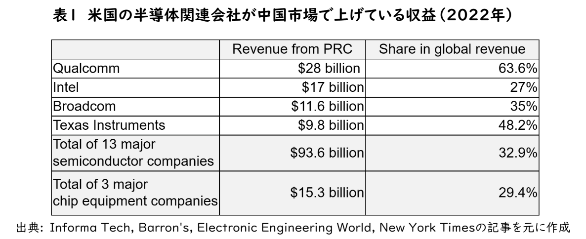 表1のように、米国の主要半導体企業および半導体装置企業は、全体として収益の3割前後を中国市場で上げている。売上金額も大きく、クアルコム1社で2022年には280億ドルを売り上げた。CHIPS法による半導体産業への補助金額の合計が5年間で527億ドル(390億ドルの投資補助、110億ドルの研究開発補助など)であることと比較すると、中国市場の重要性は明白である。