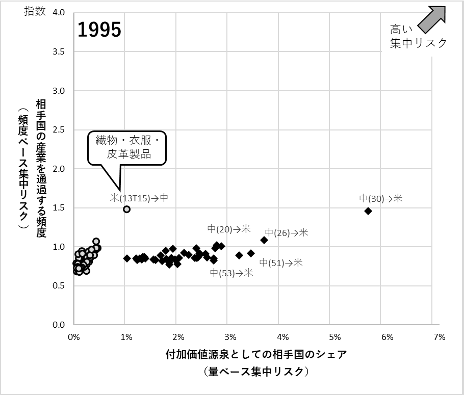 図1:米中サプライチェーンの相互リスクポジション:1995年、2020年