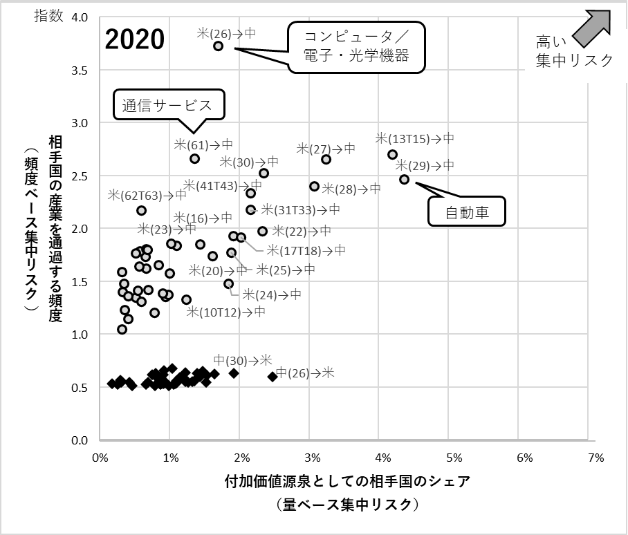 横軸は、米国と中国がそれぞれ各製品の付加価値源泉として占めるシェア、縦軸は生産システムの中でサプライチェーンが相手国の産業を通過する頻度を示している。したがって、マーカーが上方右側にあるほど、サプライチェーンの相手国に対する地理的集中度・依存度が高いことを表している。