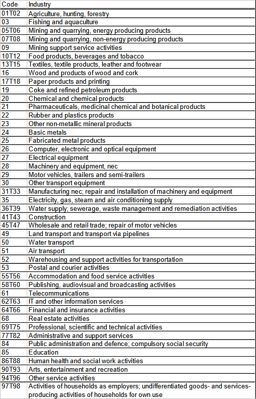 表1:OECD国際産業連関表 産業部門分類(45部門)