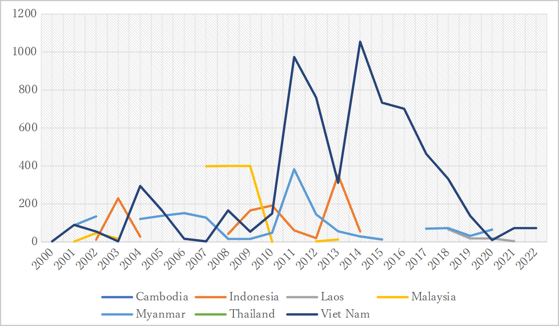 図1. ロシアから東南アジア諸国への武器輸出(2000 - 2022)(単位:100万US$)