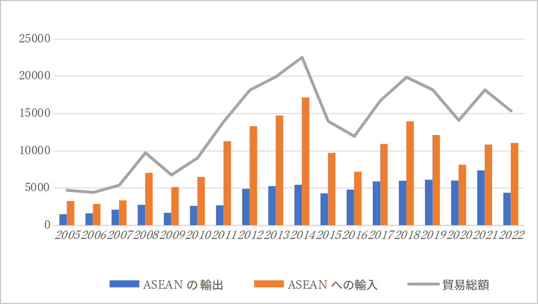 図2. ASEANとロシアの物品貿易(2005 - 2022)(単位:100万US$)