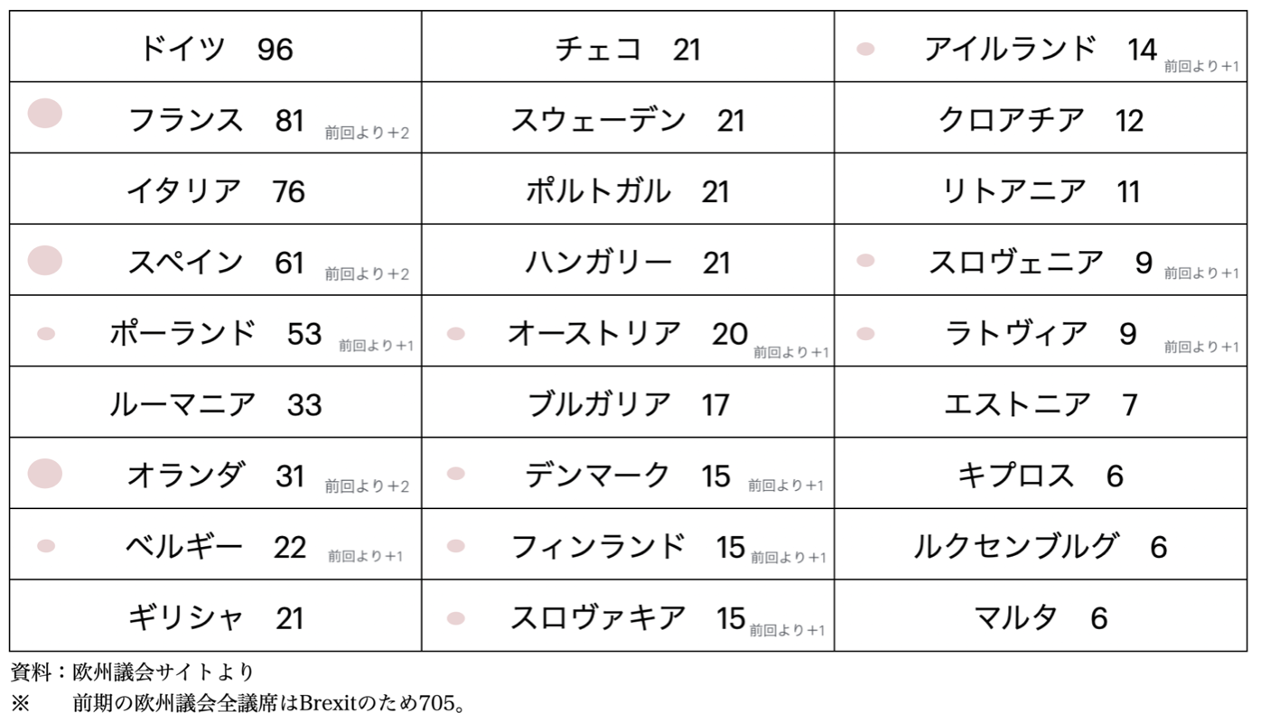 欧州議会選挙は今回で10回目となる。期間は6月6日からの4日間、総有権者数は3億6257万3028人に上る。インドには到底及ばないが、アメリカは上回る。加盟国が選挙区となり、それぞれ議席数が割り当てられる。選挙直前はブレグジットにより705に減っていたが、フランス、スペイン、オランダの2議席増など調整がはかられ、総議席数は720となった(第1表)。この3カ国とも、右派・極右政党が議席を増やしている。加盟国つまり選挙区ごとの定員は、最大がドイツの96議席、最低がキプロス・ルクセンブルグ・マルタの6議席であるが(同じく第1表)、一票の格差がなんとも巨大だ。主権国家内の議会選挙とは質的に異なる。ヨーロッパ市民の主権的意思の表明が制度的に担保されたものとは言い難い。欧州議会選挙の重要性が高まれば高まるほど、一票の格差が問題になるという構造的な問題が存在する。この点に留意しておきたい。