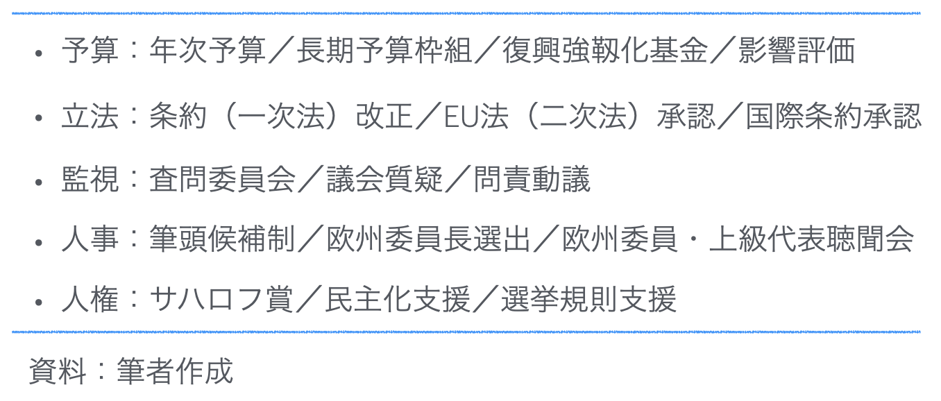 欧州議会の権限は着実に拡大してきた。2009年リスボン条約までの制度改革により、予算・立法・監視・人事・人権の5つの分野で一定の政治力をもつに到っている(第2表)。域内政治だけでなく、対外政治の面でも、EUにとって重要な存在である。本来的にはセカンドオーダーの選挙であってはならない水準の権限が、欧州議会に与えられている。過半数361議席をめぐって、欧州政党(European Political Parties)が選挙戦にしのぎを削った。