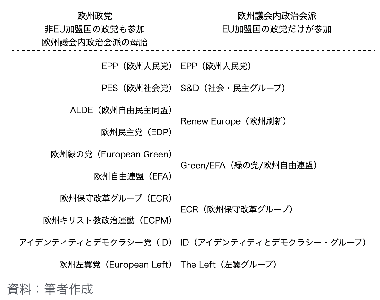 現在の7つの政治会派は次の通り(第3−1、3−2表)。キリスト教民主主義系のEPP(欧州人民党)2、社会民主主義系のS&D(社会民主グループ)3、中道リベラルのRenew(欧州刷新)4の3会派が、EU賛成派のいわゆるグランドコアリションを形成する。今回の選挙ではEU懐疑的右派・極右の躍進が予想される中、グランドコアリションが過半数を取れるかどうかがひとつの焦点となっていた。