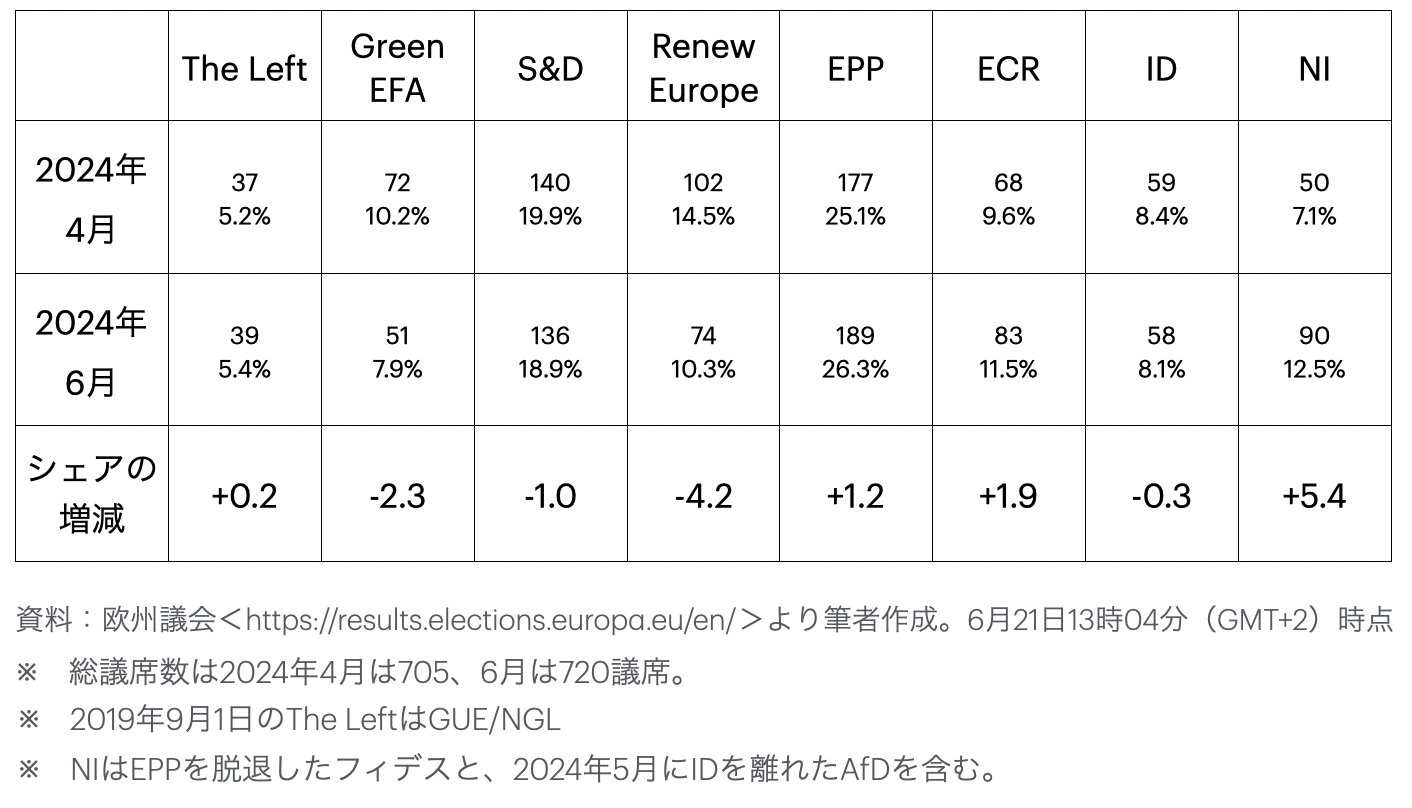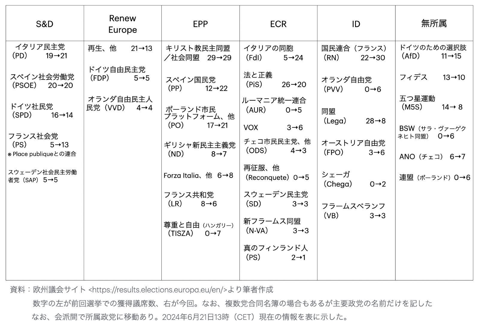 親EU派のグランドコアリション(EPP・S&D・Renew)が過半数を維持したものの(過半数361に対して399議席、55.4%獲得)、EU懐疑的右派・極右勢力(ECR・ID)も着実に議席を増やした(141議席、19.6%)。無所属のAfDとフィデスを加えると23%に達する。親EU派の低減傾向とEU懐疑派の増大傾向は、今回も変わらなかった。もはや長期的潮流である。大敗したのが中道リベラルのRenewとグリーンであった。Renewは第4党に後退(74議席、10.3%)、かわりにECRが第3党に躍進した(83議席、11.5%)。右派・極右勢力増大の今後の影響として、ウクライナをはじめとした加盟国拡大に必要な基本条約改正が難しくなった点を挙げられる。EUの権限拡大は強い反対に見舞われるだろう。また個々の重要法案が採択されなくなる可能性も指摘できる。何れの場合も、EPPがS&DおよびRenewと共同歩調を維持できるか、むしろグランドコアリションとは袂を分かち、ECRと連携しはじめるかどうかが鍵になる。後者の場合、地政学的不確実性にあって求められるEU一体となった行動がますます困難になっていくだろう。