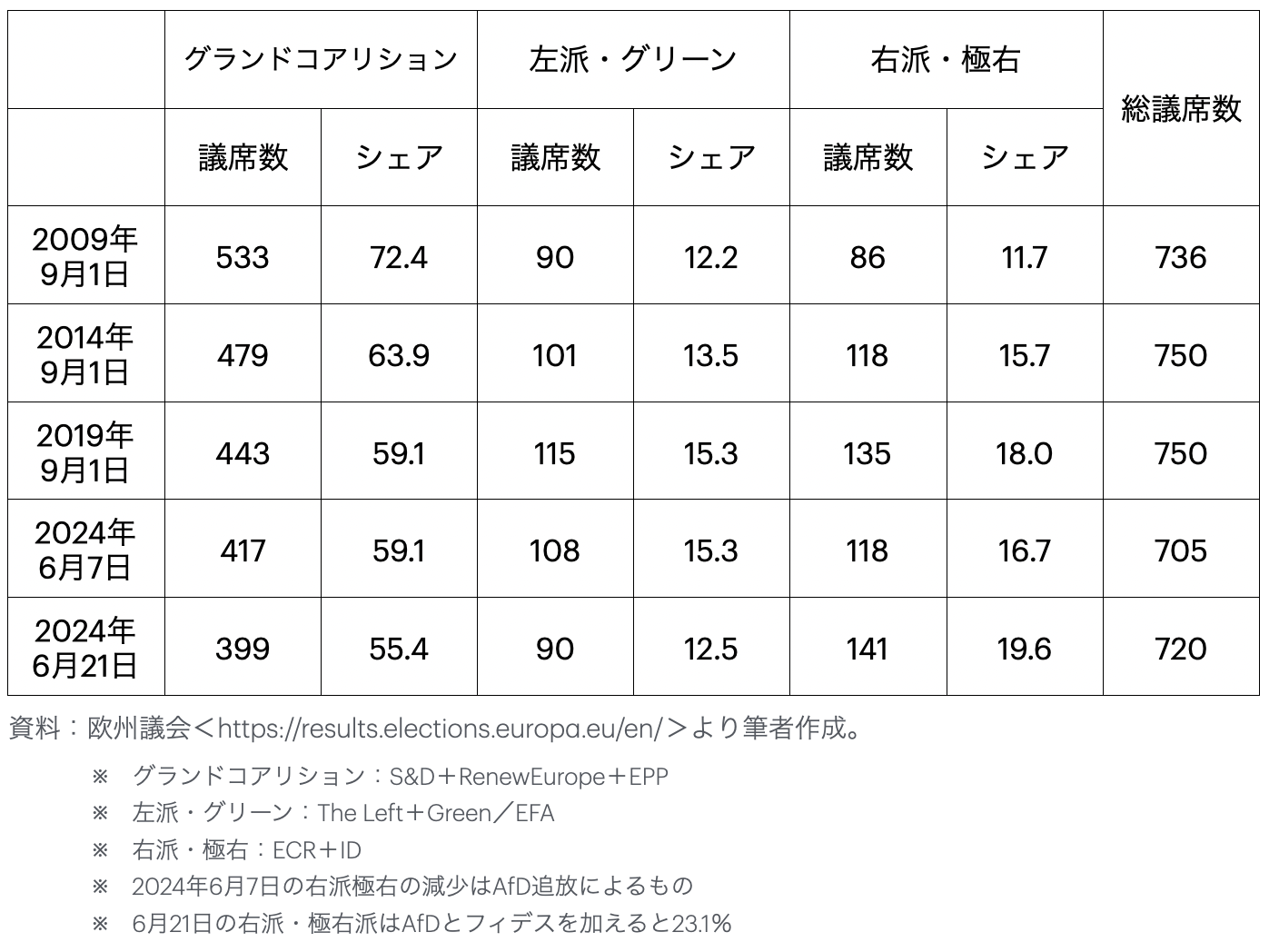 選挙前の予想では、EU懐疑的右派・極右勢力が躍進するとみられていたが、親EU派のグランドコアリションが一応は過半数を確保した。しかし得票率は過去最低の55.4%であった。第5表に示したとおり、2009年に72.4%の議席シェアを誇っていたグランドコアリションは、以降3回の選挙すべてにおいて議席を減らしてきた。次回選挙で過半数を確保できるかどうか、見通しがつかない状況だ。それに対して、EUの権限拡張を批判し加盟国に権限を戻すことを主張するEU懐疑的右派・極右勢力は、今回激増でこそなかったものの、着実に議席増を実現している。ECRとIDの合計は141議席、得票率19.6%に達した(以上、第4表、第5表)。現在無所属のAfDやフィデスも合わせてこの勢力全体の規模をみると、議席シェアは23%にまで伸びる(メディアによっては25%に達したとの推定もある)。グランドコアリションとは真逆に、この勢力は過去15年の間一貫して議席を増やしている。