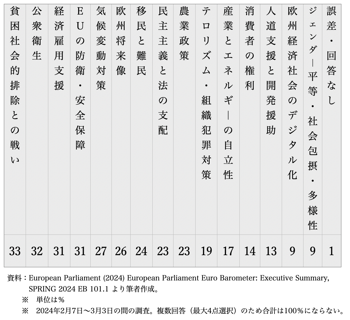 選挙戦の最中には、EUグリーンディールに反発する農家のトラクター抗議がブリュッセルのEU本部はじめ欧州各都市で勃発した。EU批判を刺激的にアピールする映像が、多くのメディアに流れたのも記憶に新しい。ユーロバロメーターによると、選挙の主要争点は所得・雇用や医療であり、選挙前に右派・極右政治家の刺激的発言で注目されていたマイグレーションではなかった(第7表)。実際のところ、EU懐疑的右派・極右勢力がアピールしたのも、マイグレーションそれ自体というよりむしろ、生活不安であった。各国のグリーン系政党は、この有権者の反発をまともに受ける形になってしまった。