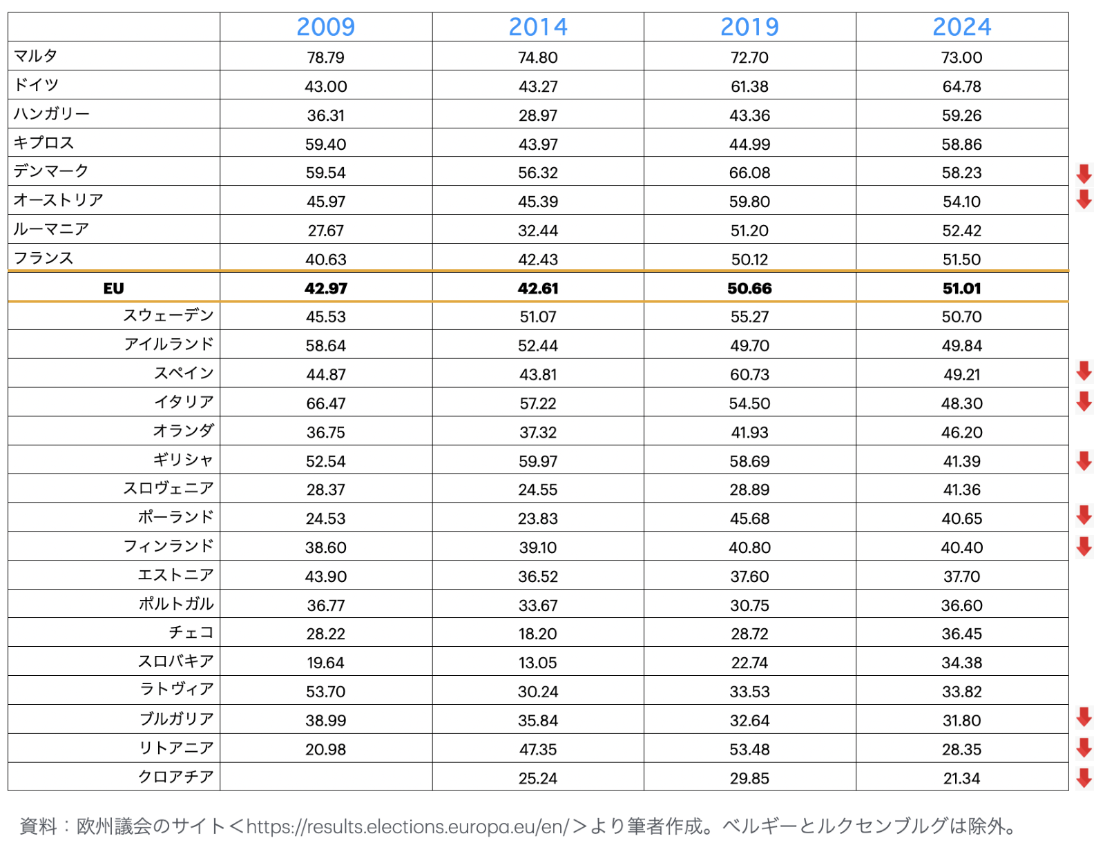 カタールゲート(収賄)、ロシアゲート(情報操作)、チャイナゲート(情報漏洩)により、欧州議会の対外的脆弱性が露呈したなかでの選挙戦となってしまったが、投票率は今回も上昇した(51.01%)。これで過去3回連続の上昇だ(第8表)。いまだ各国事情が優先される国内選挙の寄せ集めで、セカンドクラスの選挙とも揶揄されるが、欧州議会選挙のヨーロッパ化は、着実に進んでいる。ただしそれは、EU懐疑的右派・極右勢力の拡大や、農家のトラクター抗議といった、EU批判に拠るところ大である。EUへの強い批判が欧州議会選挙のヨーロッパ化をうながすという、EU推進派にとっては危うい情況が生起している。