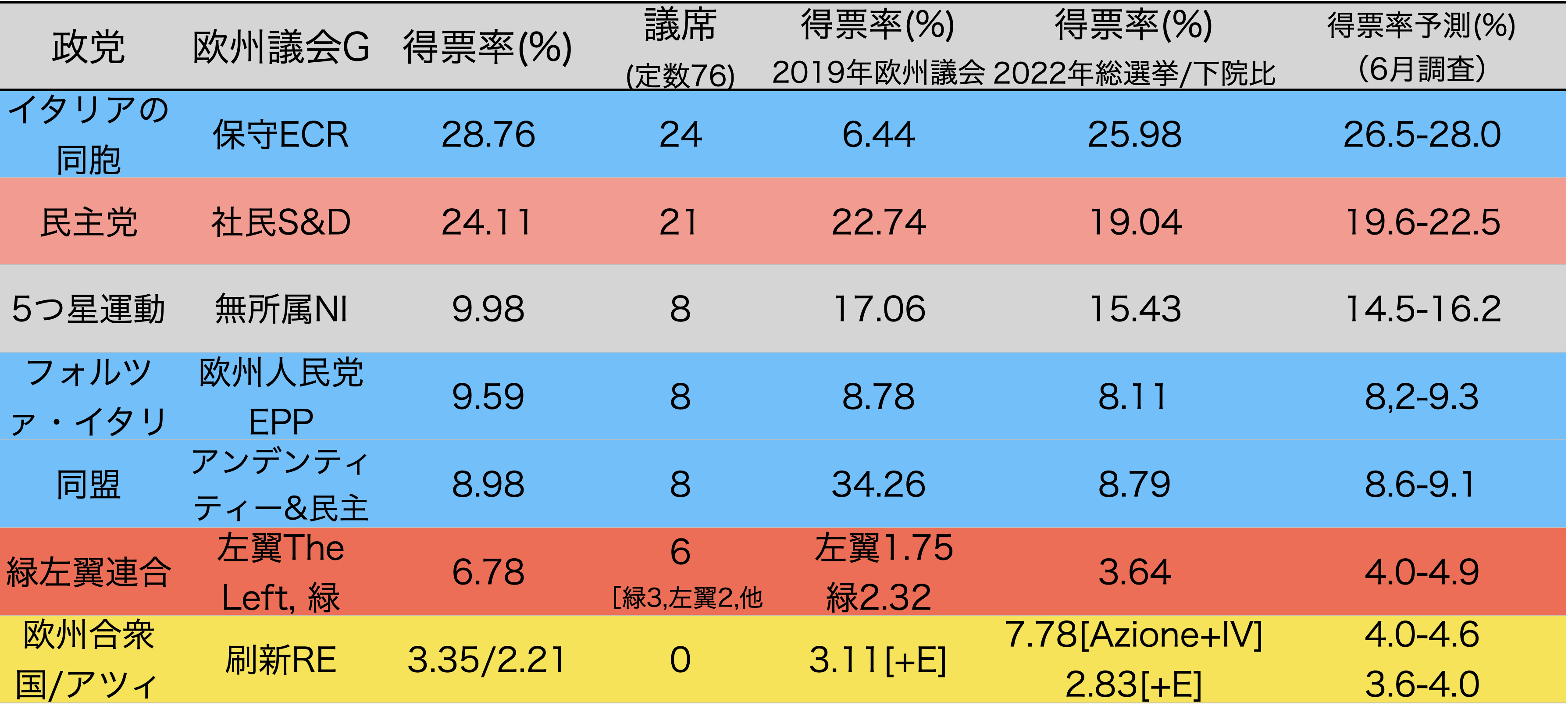 [出典]イタリア内務省・欧州議会等のデータを元に筆者作成。得票率予測については、Termometro politicoのウェブサイトに掲載された各社世論調査の最小値と最大値を掲載。国内党派(選挙連合): 青:中道右派(与党) 赤:中道左派(野党) 黄色:中道(野党)