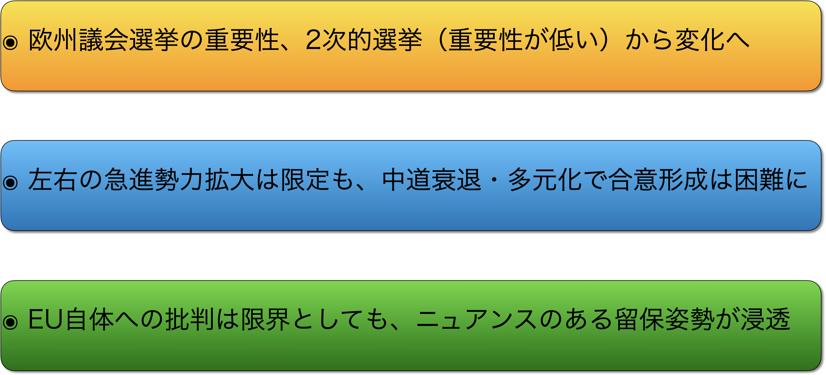 全体としてみれば、イタリアの選挙結果も、当初の懸念された状況と比べれば、急進右派や急進左派が大きく延びたとは言えない潮流の中にあると言えるだろう。しかし、イタリアにおいても政党の多元化が進んでいて、欧州レベルでも同様に内部で安定した合意形成を図ることは困難だろう。欧州レベルで穏健な2大勢力のS&DとEPPを核とした従来の運営は、今回の総選挙を通じてほぼ維持しがたくなったと言えるだろう。 EU批判は懸念したほど盛り上がらなかったか、移民対策や経済対策も含めて様々な形でEU批判勢力の要求を先取りした形で選挙戦が戦われてきた。急進勢力が一定の範囲に留まったのは、そのようなEU自体の「変質」のおかげかもしれない。