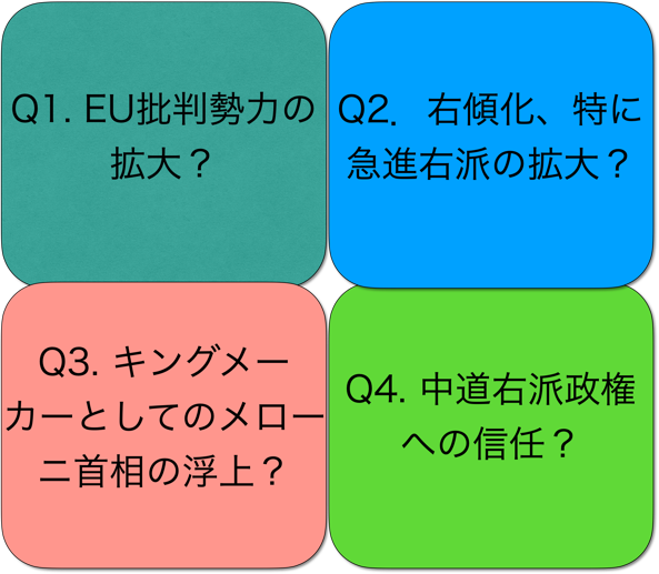 イタリアと欧州議会選挙の関係については、選挙前に注目されていた4つの争点から 考えるのが有益で ある(図1)。
