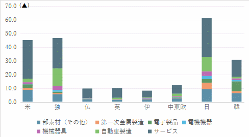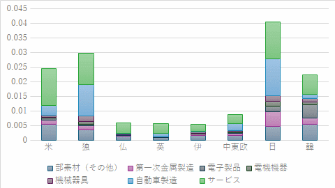 次に、生産ネットワークを通じた海外への付加価値ベースでの波及効果の推計結果をみていきたい(図4)。日本に対して▲6,150万ドルの波及効果があり、金額ベースで最も大きい影響を受けることが示されている。但し、対GDP比でみると▲0.001%となり規模は大きくない。産業別には、主にサービス、自動車製造、部素材(その他)、第一次金属製造などへの影響が大きい。次に影響が大きいのは、ドイツ(▲4,670万ドル)、米国(▲4,520万ドル)、韓国(▲3,080万ドル)である。対GDP比でみるとドイツ、韓国はそれぞれ▲0.001%と▲0.002%と日本と同程度であり、米国は▲0.0002%と経済全体からみれば影響は僅かである。産業別の結果は前節でみた中間財の供給構造に付加価値率の要素が加わっている。日本はサービス、自動車製造、部素材、ドイツはサービス、自動車製造、米国はサービス、部素材、韓国はサービス、電子製品、部素材の産業への波及効果が比較的大きい。